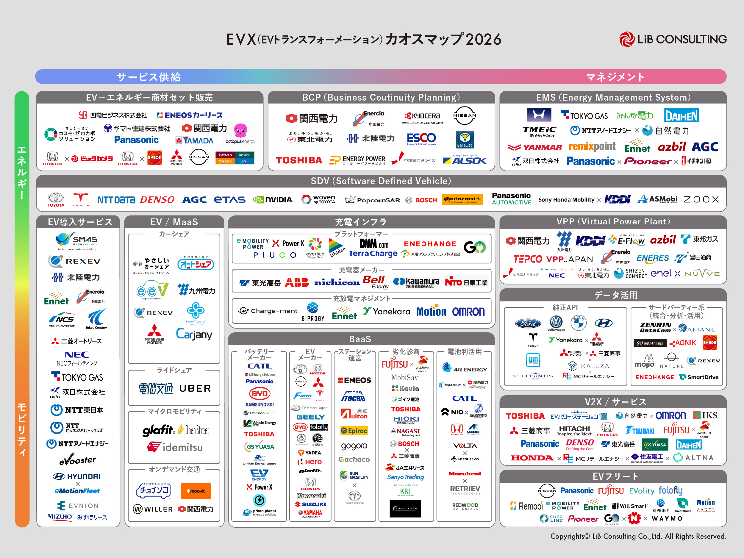 「EVトランスフォーメーション・カオスマップ」2026年度版 サービス詳細レポート2022年より公開しているEVXカオスマップの最新版「EVトランスフォーメーション・カオスマップ2026年度版」を作成。計170社を超えるEVX関連企業を掲載させていただきました。
