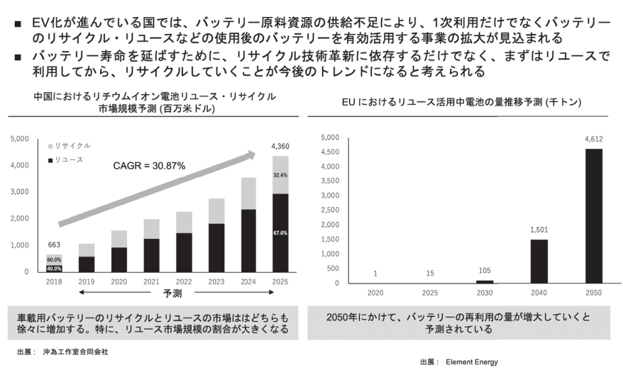 このような背景もあり、今後はバッテリー寿命を延ばすために、リサイクルの技術革新に依存するだけでなく、まずはリユースで利用してからリサイクルしていくことがトレンドになると考えられます。