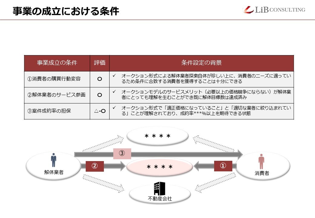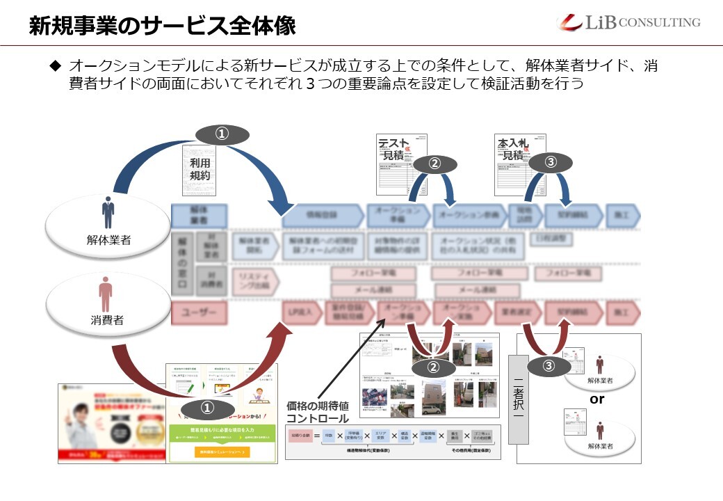 ① マッチングプラットフォームビジネス立ち上げにあたり、マーケットリサーチ、解体業者の収益構造の調査を実施、その上で、ビジネスモデルを成立させるために解決しなければならない課題の洗い出しや、戦略(どのように業界で戦っていくか)を策定