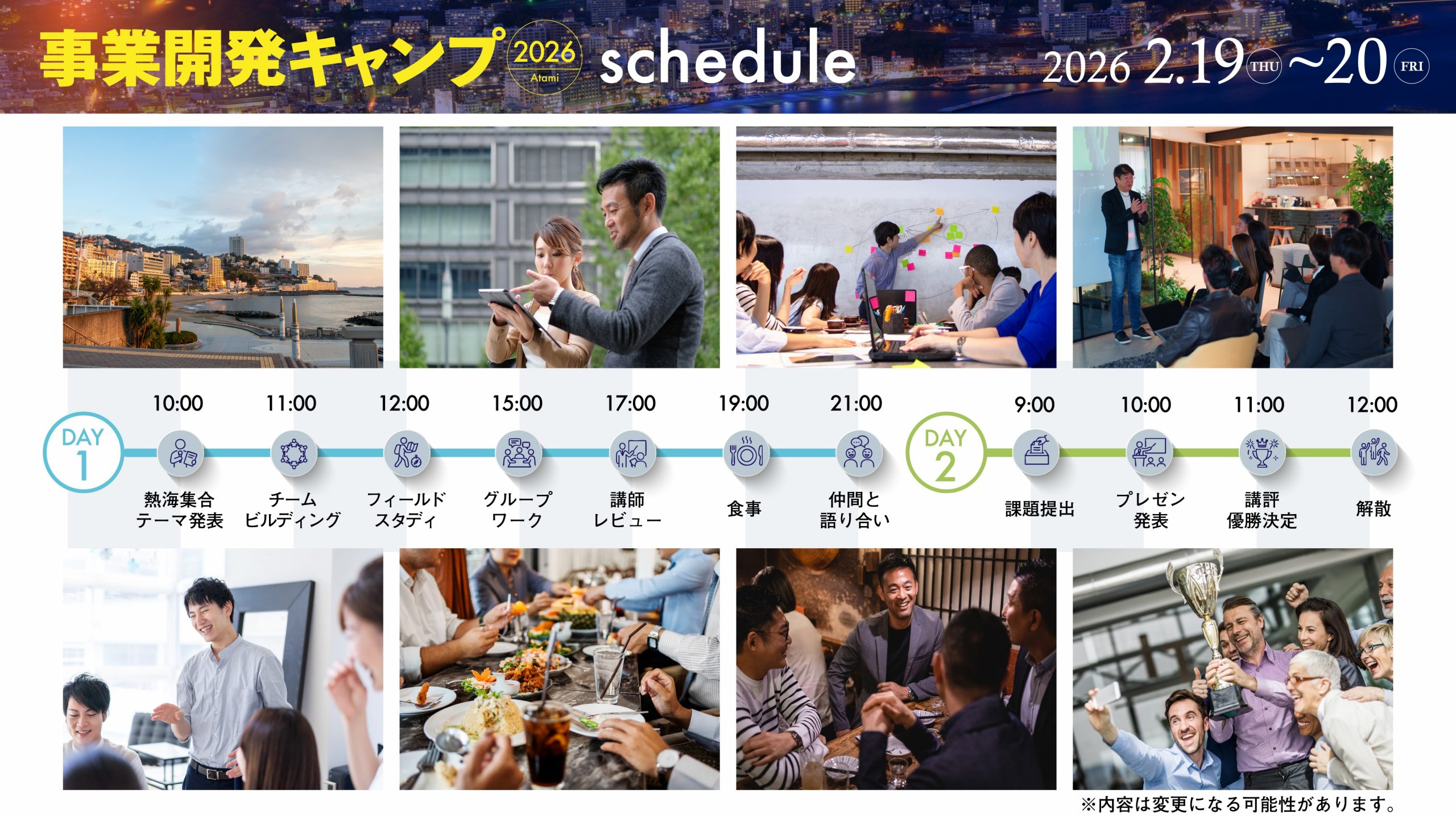 事業開発キャンプ2026Atamiでは、1泊2日のキャンプ期間中に、参加者の皆さんがグループに分かれ、具体的な「事業開発のタネ」のテーマを設定します。参加者同士で意見を出し合ったり、フィールドスタディを通じで事業アイデアを具体化し、プレゼンを頂きます。