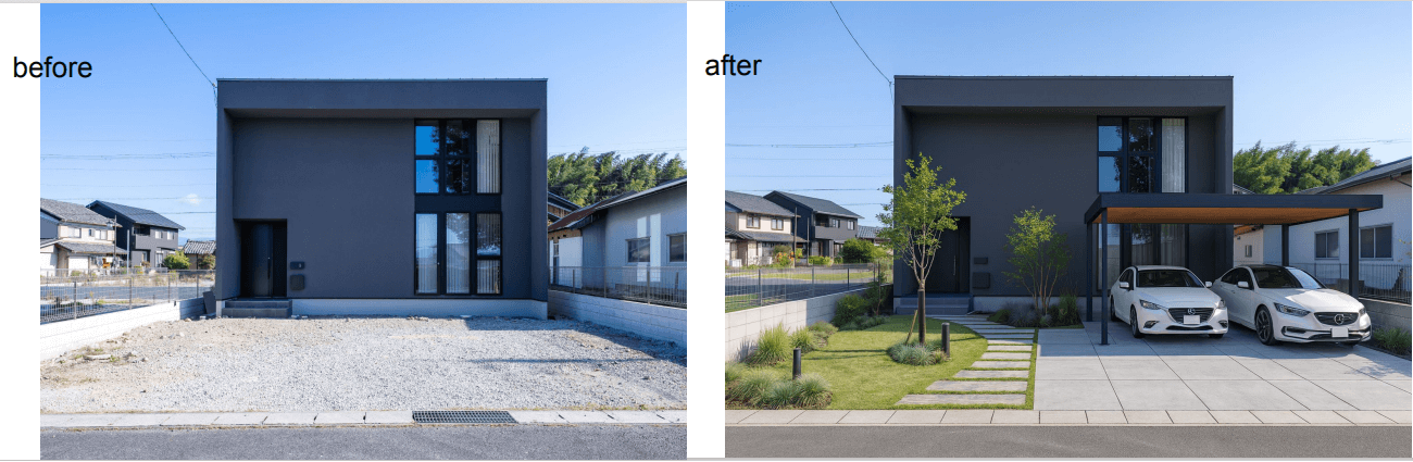 以下はAIにて、”たった2分”で外構生成された一例です。