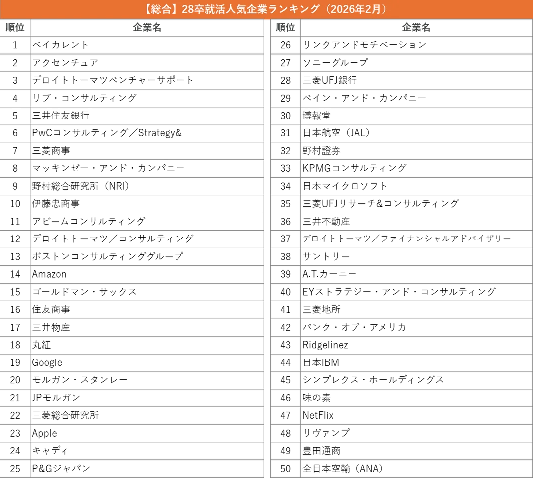 - 外資就活総合研究所、外資就活ドットコム利用学生対象の「2028年卒 就活人気企業ランキング(2026年2月)」を発表
