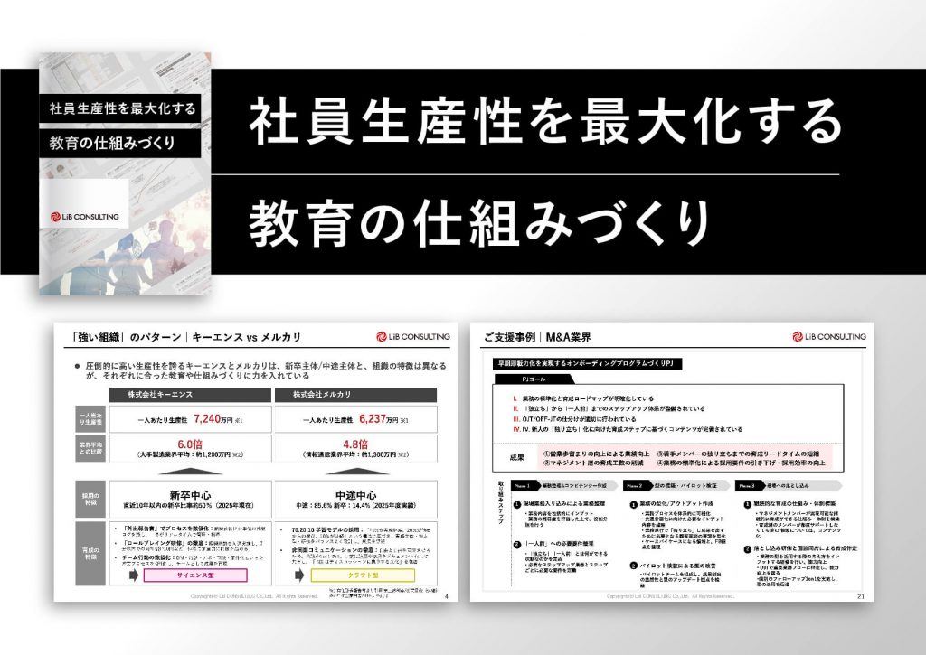 社員の生産性を最大化するために「教育の仕組みづくり」を体系的に整理した解説資料です。採用市場の現実や組織デザインの視点から全体像を捉え、キーエンス型のサイエンス志向とメルカリ型のクラフト志向を比較しながら説明しています。さらに、組織の型(ピラミッド型/ダイヤモンド型)ごとの育成ゴールの設定方法や、オンボーディングの設計、コンピテンシーの定義、OJTとOFF-JTの使い分け、会議体や評価制度への反映方法までを実務レベルで整理しています。若手社員や未経験層を早期に戦力化し、規模拡大の局面でも生産性を維持するための実践的なポイントを、図解を交えてわかりやすくまとめています。