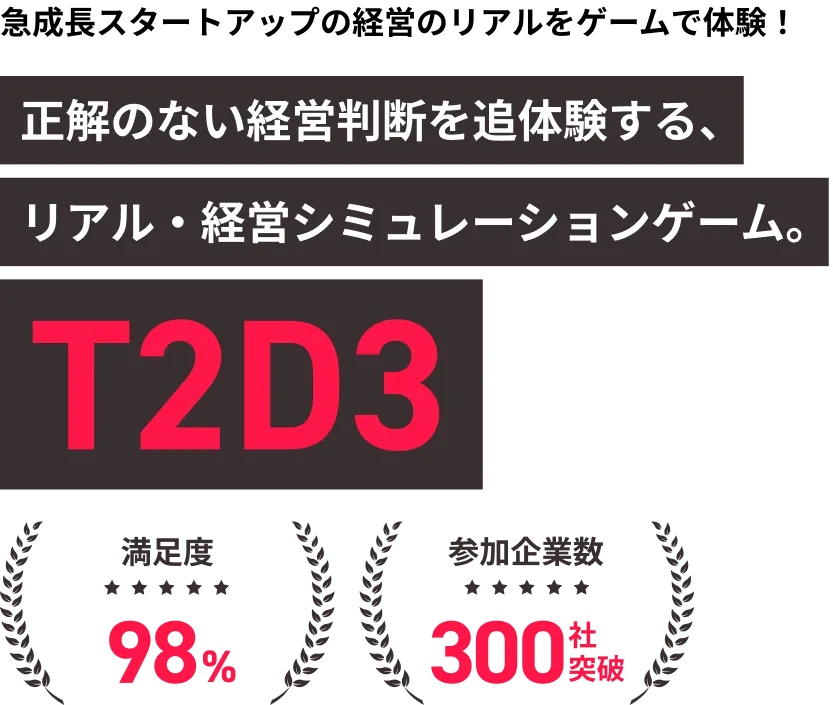 経営シミュレーションゲーム『T2D3』は、この爆発的な成長を"自分の手で"追体験できるゲームです。採用、マーケティング、資金調達、プロダクト開発——限られた予算の中で何に張り、何を捨てるのか。100社・500プロジェクト超のスタートアップ支援実績を持つリブコンサルティングが設計した、リアルすぎる経営判断の連続が待っています。