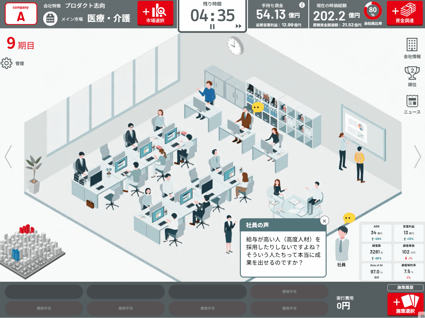 ゲームは全8期のターン制。採用・マーケティング・資金調達・プロダクト開発など、全29種類の施策カードから戦略を組み立て、ARR100億円を目指します。