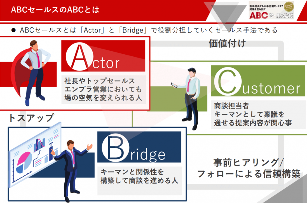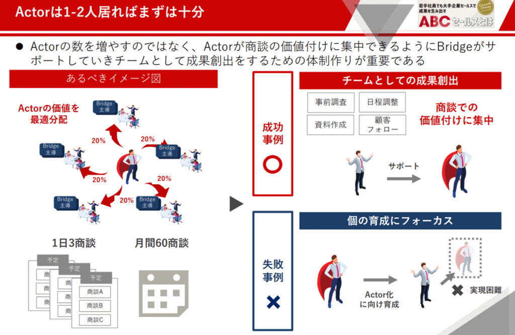 従来はActor(トップセールス)が全ての商談を担う構造であったが、それでは新人セールスマンが育ちにくいという課題があった。ABCセールスにおいて、新人はいきなりActorを目指すのではなく、まずBridgeから成長しやがてActorへ育っていくという流れが設計されている。これにより、Aの負担軽減と組織全体の成果最大化、新人の早期立ち上がりが同時に実現される。